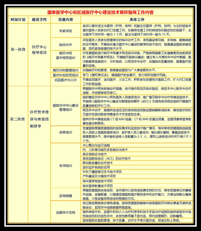 重点专科将根据受援医院的专科难点、重点展开,重点专科为肿瘤学科主要涉及病理科、影像科影像诊断,五官科咽喉癌、食管癌手术及胸外科微创手术等。重点专科为心胸外科和心脑血管,主要开展心血管疾病:先心病、瓣膜病、冠心病,通过对口支援工作,帮助受援医院在医院管理、技术质量、诊疗水平等方面改进,不断提高基层医疗卫生服务能力和水平,使受援医院达到三级甲等医院的基本技术标准。限于医院实际情况,一般提供以下帮扶服务: